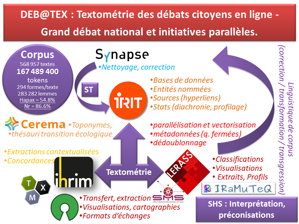 Nous-mêmes, et conformément à nos engagement vis-à-vis du Vrai débat, nous avons cherché à partir de l'intégralité des contributions à synthétiser les éléments récurrents ou les thématiques traversant le débat grâce aux méthodes de statistique textuelle et de linguistique automatique permises par notre logiciel Iramuteq (Pierre Ratinaud, Lerass / Labex SMS).