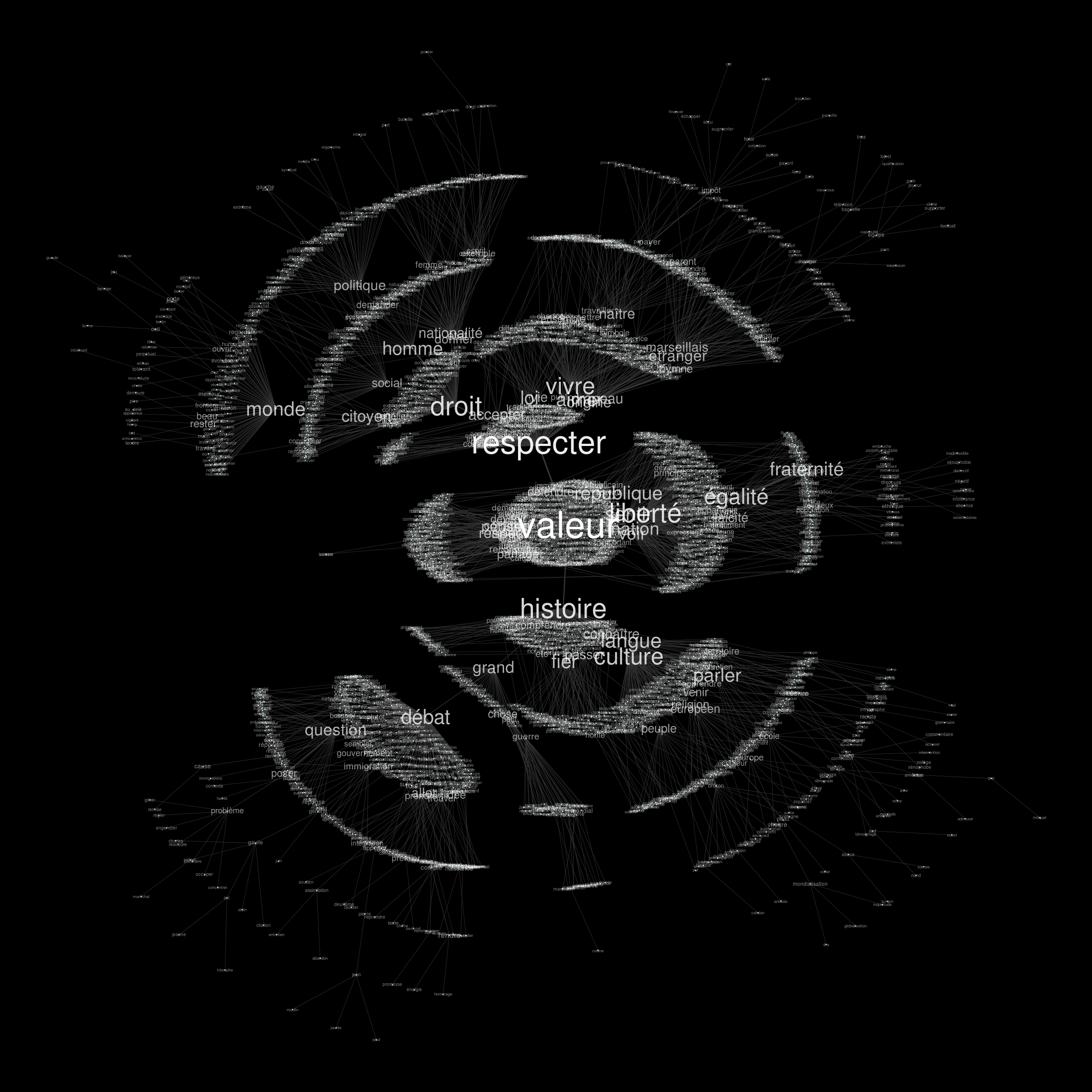 Vous êtes ici : Accueil / Captures d'écrans / Résultats / analyse de similitude sur les formes pleines du corpus de l'identite nationale